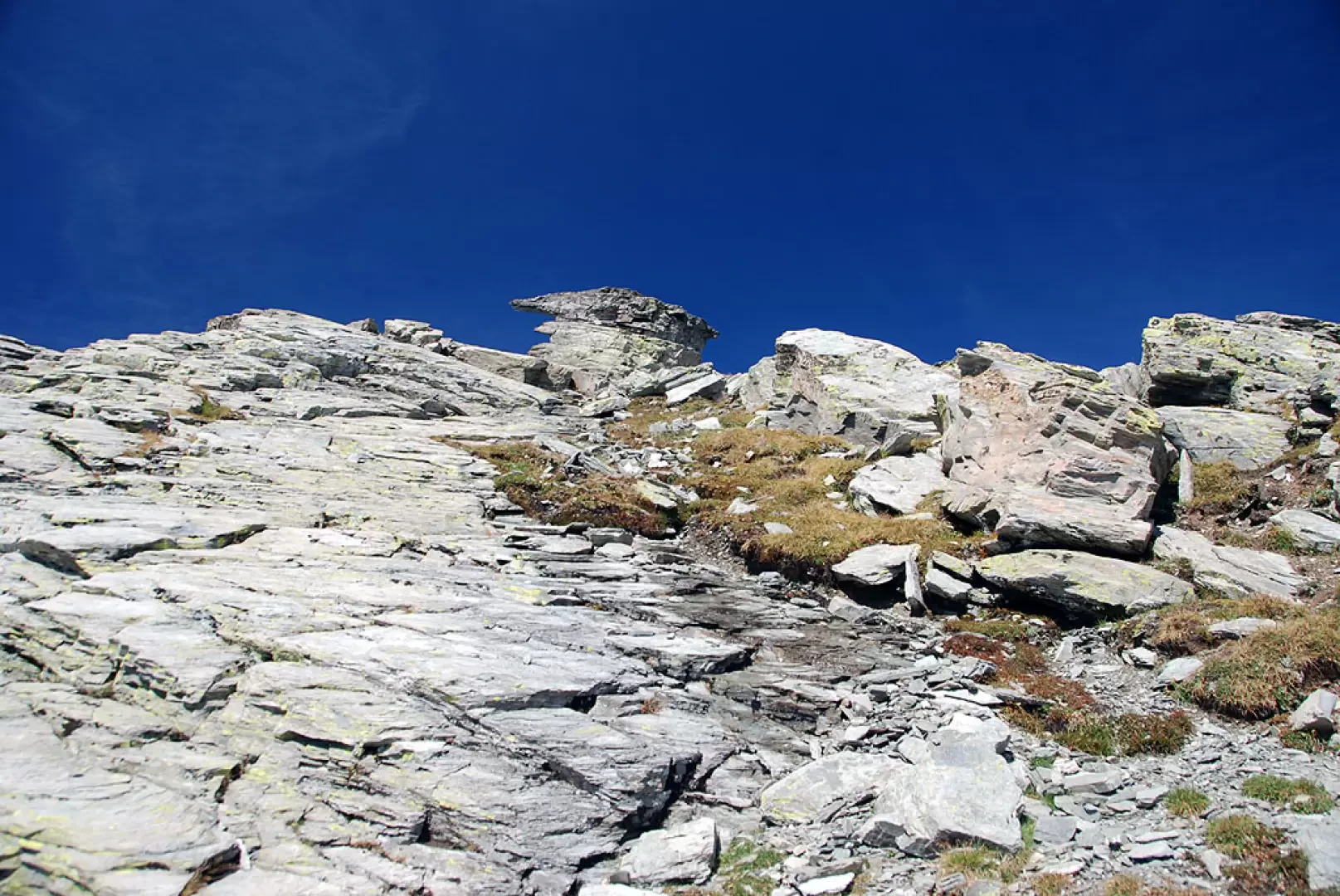 Dal parcheggio risalire brevemente la stradina asfaltata sino ad incontrare le paline segnaletiche poste nei pressi del ristorante-bar (1603m). Imboccare il sentiero che diparte a sinistra seguendo le indicazioni per i laghi Bellacomba, segnavia ( 8 ). Intrapreso il sentiero si costeggia un pascolo e, dopo una breve discesa, si costeggia il Torrent du Ruitor sino ad un ponticello in legno; lo si attraversa portandosi sulla destra orografica dopodiché il sentiero prende quota con alcune svolte inserendosi nella fitta abetaia. Pochi minuti di cammino e si incontra la prima delle spettacolari cascate del Ruitor (1700m, 0h15'). Proseguire ora con una salita un po' più impegnativa, superato un caratteristico ponticello in pietra si raggiunge in breve l'isolato casolare di Parcet (1760m, 0h20'). Si fuoriesce dal bosco e si procede per un breve tratto a mezza costa poi, dopo un paio di svolte, si attraversa un altro ruscelletto e si entra nuovamente nel bosco sino ad arrivare ad un ponte in legno ove diparte il sentiero per la seconda cascata. Proseguire sul sentiero principale ed iniziare una lunga serie di svolte sino ad incontrare la palina segnaletica (1996m, 1h10') che indica la terza cascata: per chi lo desiderasse con una breve deviazione in pochi minuti si raggiunge un bel punto di vista su di essa. La salita prosegue su di un tratto di sentiero ottimamente scalinato sino ad incontrare un ulteriore bivio (2147m, 1h40'): qui si svolta a destra seguendo le indicazioni per i Laghi di Bellacomba. Il percorso segue ora un tratto con qualche saliscendi per poi riprendere a salire quando si svolta a sinistra entrando nell'impluvio del Torrent du Ruitor. Discendere verso il torrente sino ad incontrare una passerella in legno che permette il suo attraversamento. Procedere ora per un breve tratto pressoché pianeggiante sino ad incontrare una nuova palina segnaletica che riporta il sentiero (18) per Cérellaz. Trascurata la deviazione il sentiero, con alcune svolte, permette l'agevole superamento di un costolone roccioso; dopo un breve tratto rettilineo nuove svolte permettono il superamento di un secondo costolone dopo di che ci si trova finalmente nel vallone in cui risiedono i Laghi di Bellacomba. Il sentiero ora procede praticamente rettilineo, in leggera salita in un ambiente idilliaco. Il vallone ripiana nei pressi di un rudere per poi risalire leggermente sino a raggiungere il primo dei laghi (che si trova sulla sinistra del sentiero). Seguendo la mezza costa, con alcuni saliscendi si raggiunge rapidamente il secondo Lago di Bellacomba (2377, 2h50') in mezzo al quale si erge uno strano isolotto aguzzo. Guadato, a sinistra, il corto torrente di comunicazione fra i due laghi di Bellacomba, si segue il sentiero (poche decine di metri) che costeggia il lago e, tralasciata a sinistra la traccia per il Col Tachuy, si traversano alcuni modesti nevai (neve anche in avanzata stagione estiva) ed alcune pietraie fino all'altra estremità del lago. Si punta ora a sinistra a traversare un più ampio nevaio, e successivamente altri nevai e zone a blocchi accatastati seguendo, dove visibili, i pochi ometti rimasti. La traccia traversa successivamente a destra (sinistra orografica dell'immissario dei laghi Bellacomba), si inoltra in altre zone a pietraie e blocchi accatastati (diventando un poco più visibile), e si dirige verso un rudere. Proseguire diritti seguendo alcuni ometti ed un tracciolino di sentiero; risalire comodamente un breve pendio sino a raggiungere un piccolo laghetto. Procedere ancora con qualche saliscendi sino a raggiungere un colletto, quotato 2636m; da qui, ormai in territorio francese, discendere brevemente per circa 200m sino a portarsi ai margini di una depressione: svoltare a destra ed iniziare a risalire il versante sud-orientale della meta finale. Il primo tratto non ha sentiero ma si intraprende logicamente seguendo il pendio che non presenta alcuna asperità. L'ambiente si fa più aspro e alternando la marcia su macereto, qualche roccetta rotta e brevi tratti erbosi si raggiunge una selletta posta tra due roccioni. Svoltare a sinistra e puntare decisamente verso la vetta, appaiono alcuni ometti che tranquillizzano l'escursionista ed indirizzano la marcia sul versante senza particolari difficoltà anche se questo tratto si fa decisamente più faticoso in quanto ripido e diretto. Dopo un primo tratto su macereto si prosegue su magra prateria sino a portarsi a ridosso di una particolare forma rocciosa: qui si inizia la marcia su placche inclinate da percorrere in aderenza. Raggiunta la base della particolare conformazione rocciosa si supera un breve scalino per poi portarsi, verso destra, in direzione della vetta. Sempre su placca inclinata si raggiunge il basamento della vetta: qui, con un semplice passo di I° si supera un gradone e ci si porta sulla vetta della Lex Blanche (2807, ) con un rudimentale ometto in pietra. La discesa avviene lungo il percorso dell'andata.